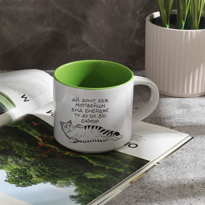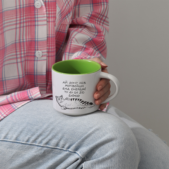 I don't have motivation and energy to do all these anymore! Фраза з мему, яка інколи така правдива. Якщо ти теж котик, у якого закінчилась мотивація й енергія — ця чашка створена саме для тебе. А ще — це подарунок для знайомих котиків, яким терміново потрібна перерва на гумор і каву.