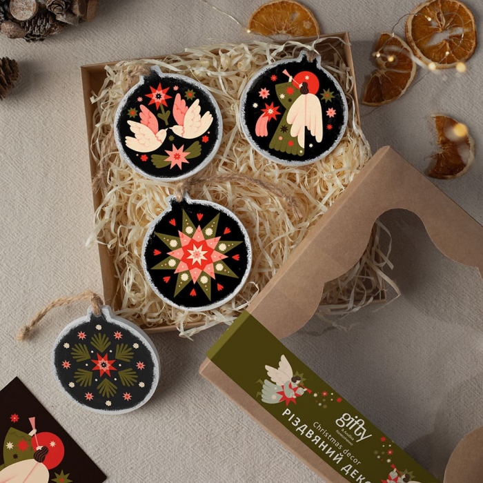 Набір із чотирьох дерев’яних прикрас із зображеннями від української ілюстраторки Альбіни Колесніченко наповнить Новий рік та Різдво особливим святковим настроєм. Зірка осяє ялинку, ангели принесуть мир, а птахи нагадають про легкість і надію.