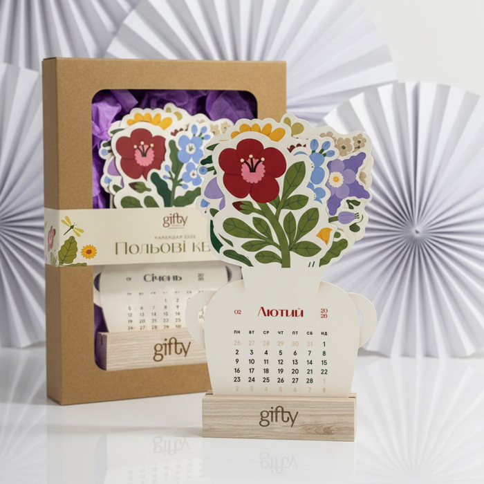 | Календар | Настільний календар на 2026 рік Польові квіти, кожна квітка – окремий місяць, з них складається букет на деревʼяній підставці, заміри коробки - 200x150x35 |