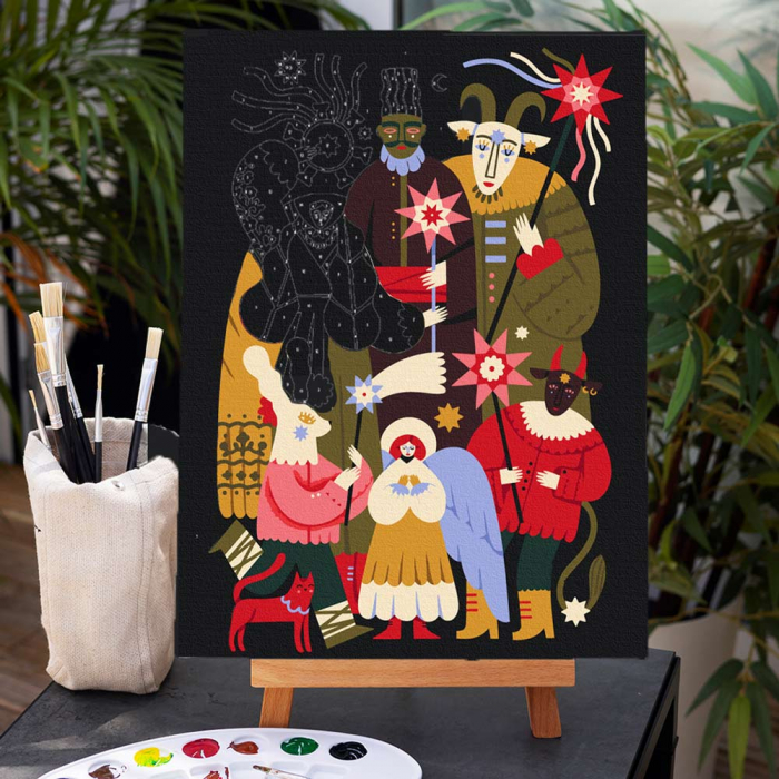| Картина за номерами | Картина за номерами Коляда, 30 x 40 см, бавовняне полотно на дерев'яному підрамнику з нанесеною пронумерованою схемою майбутньої картини, 3 пензлики різної товщини, акрилові пронумеровані фарби |