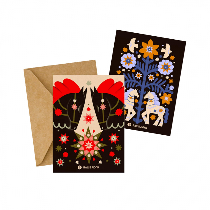 Щоб зробити ваш корпоративний подарунок по-справжньому особливим, достатньо додати до нього одну маленьку деталь — унікальну авторську листівку з підписом. Для цієї мети ми підготували два варіанти різдвяних листівок — «Дерево сили» та «Єдність» з ілюстраціями Альбіни Колесніченко. На кожній з них символ прийдешнього Нового року 2026 — Вогняний кінь.